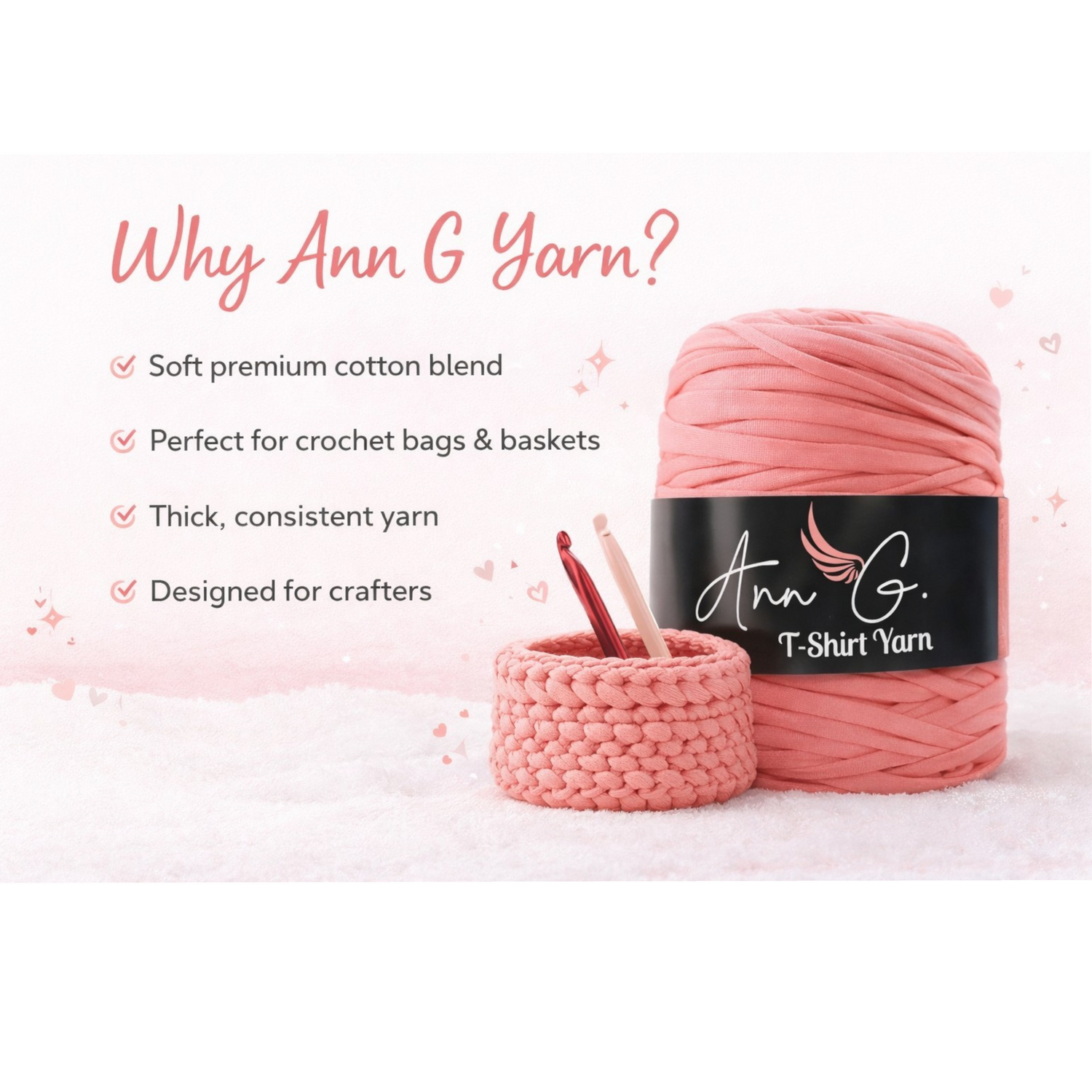 Ann G T-Shirt Yarn is designed for creators who want beautiful, durable crochet projects. Our yarn is soft, consistent, and perfect for bags, baskets, rugs, baby accessories or even costume additions.