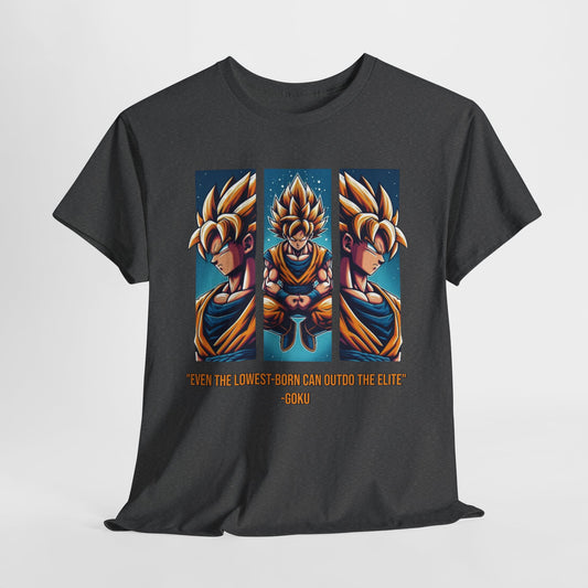 Dragon Power Tee: Goku's Rise - 'Even the Lowest Born Can Outdo the Elite' - 3 Epic Angles Design Unisex Heavy cotton Tee