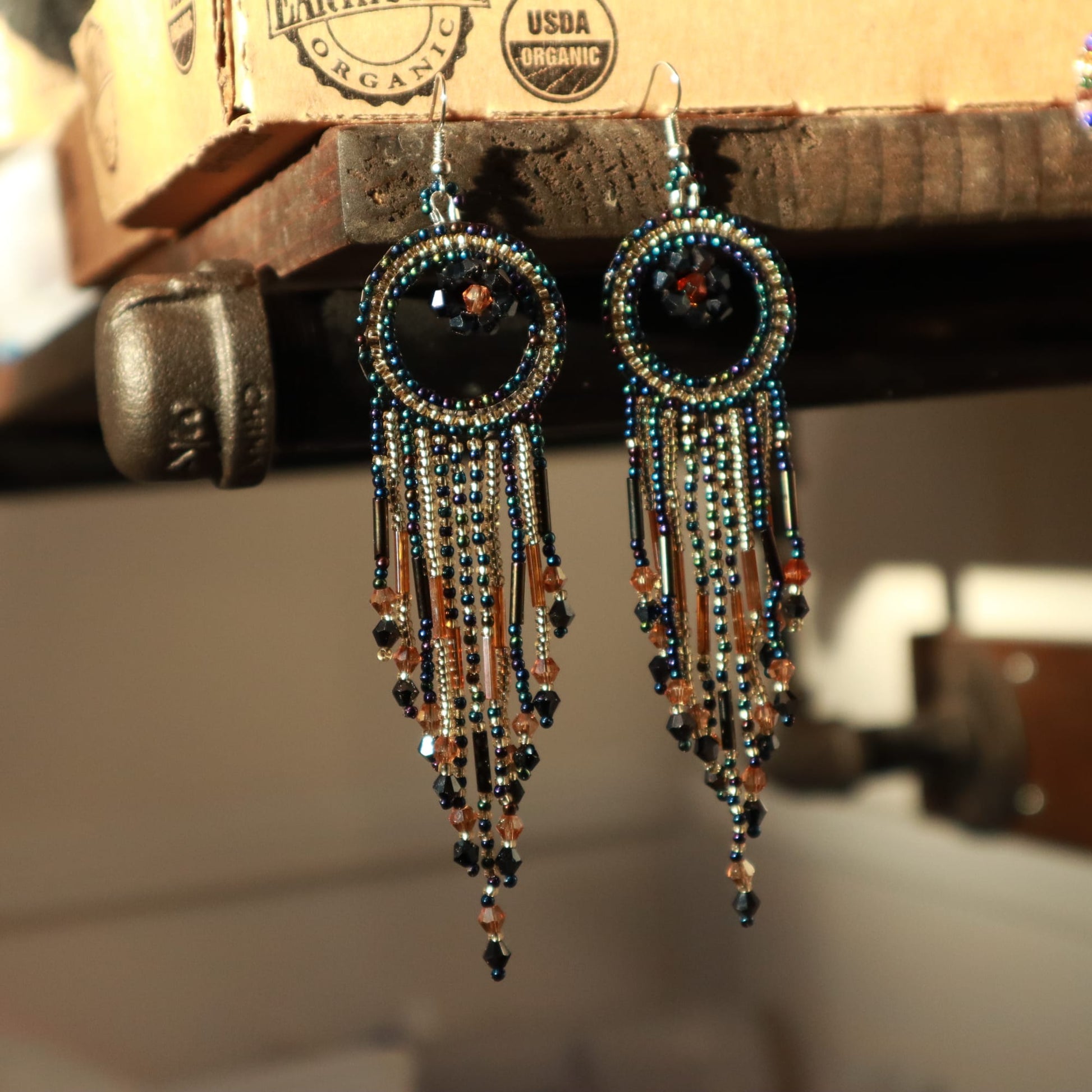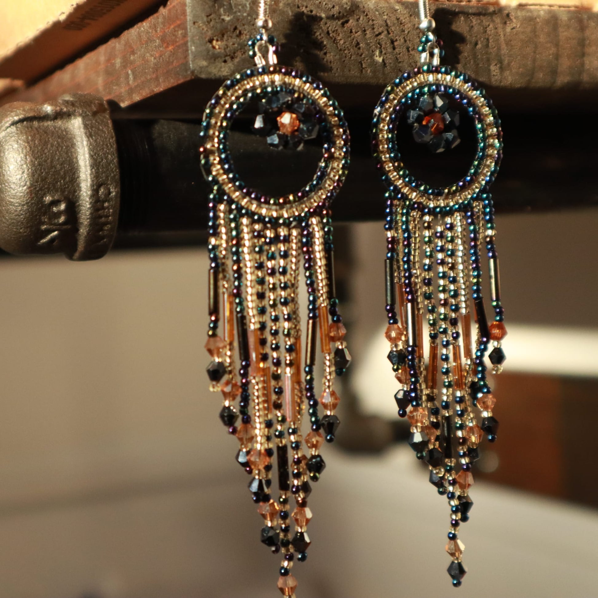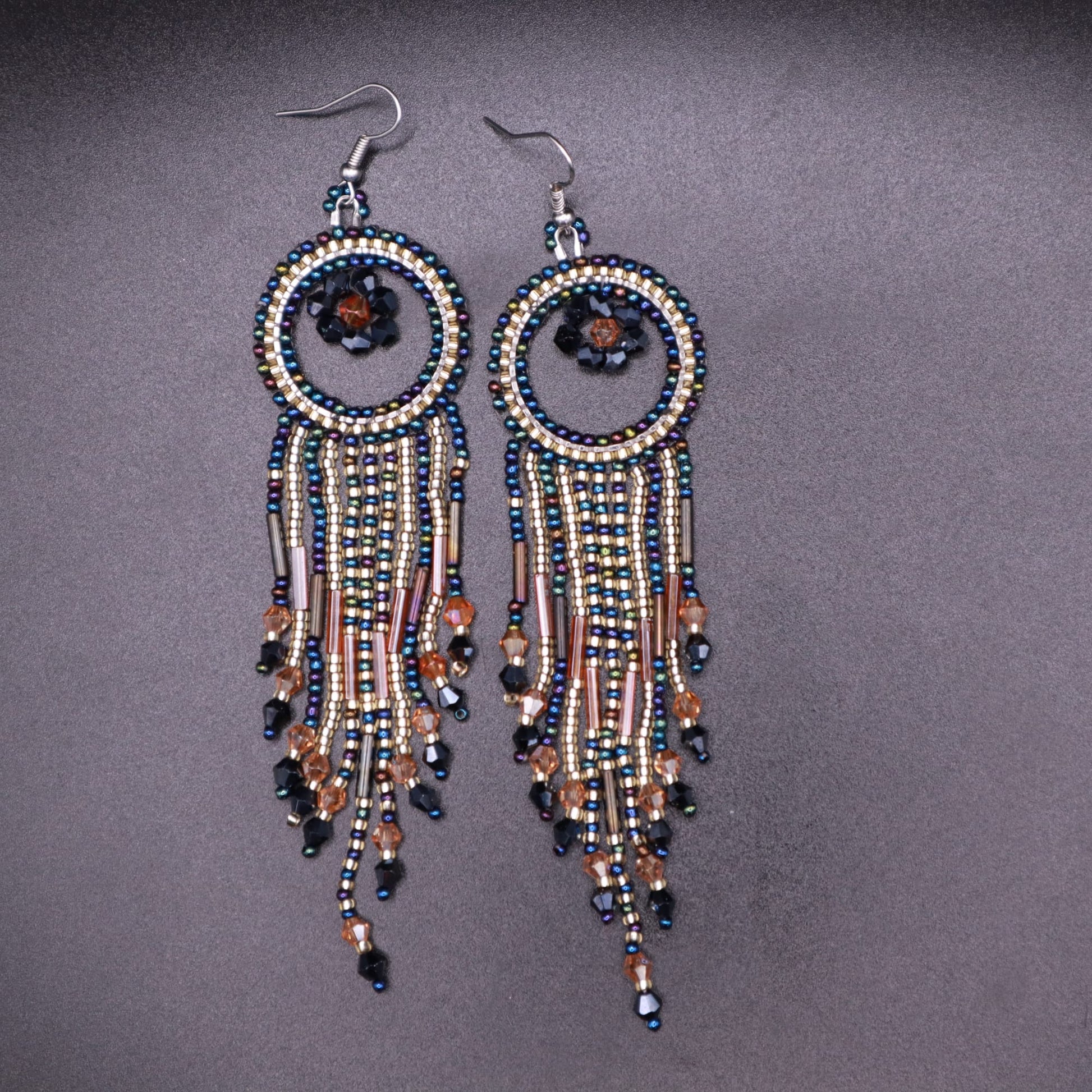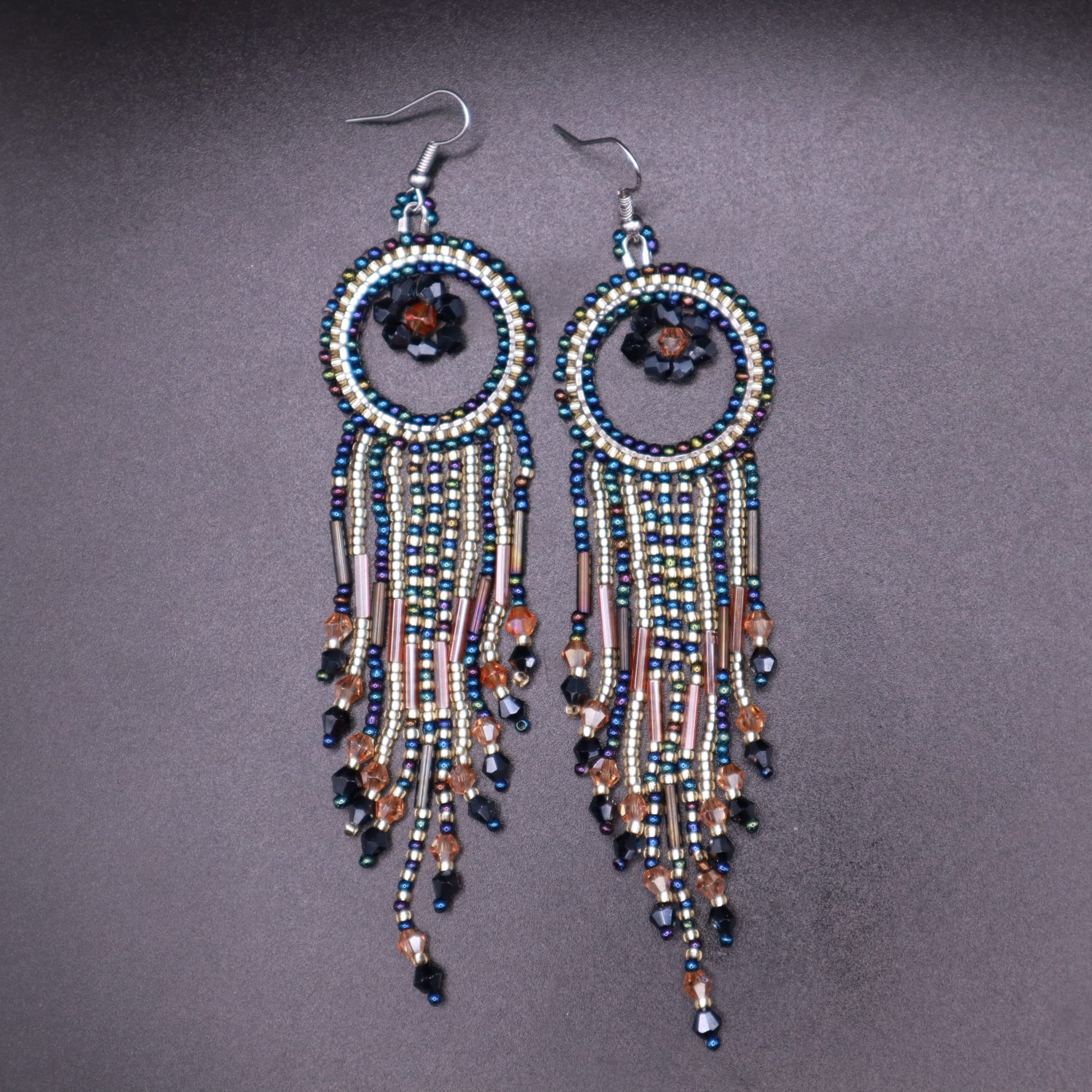 These long lightweight fringe earrings are crafted with seed beads crystals and miyuki and peacock seed bead colors. These beadwork indigenous earrings are comfortable and super lightweight, and they are perfect as a gift for women.