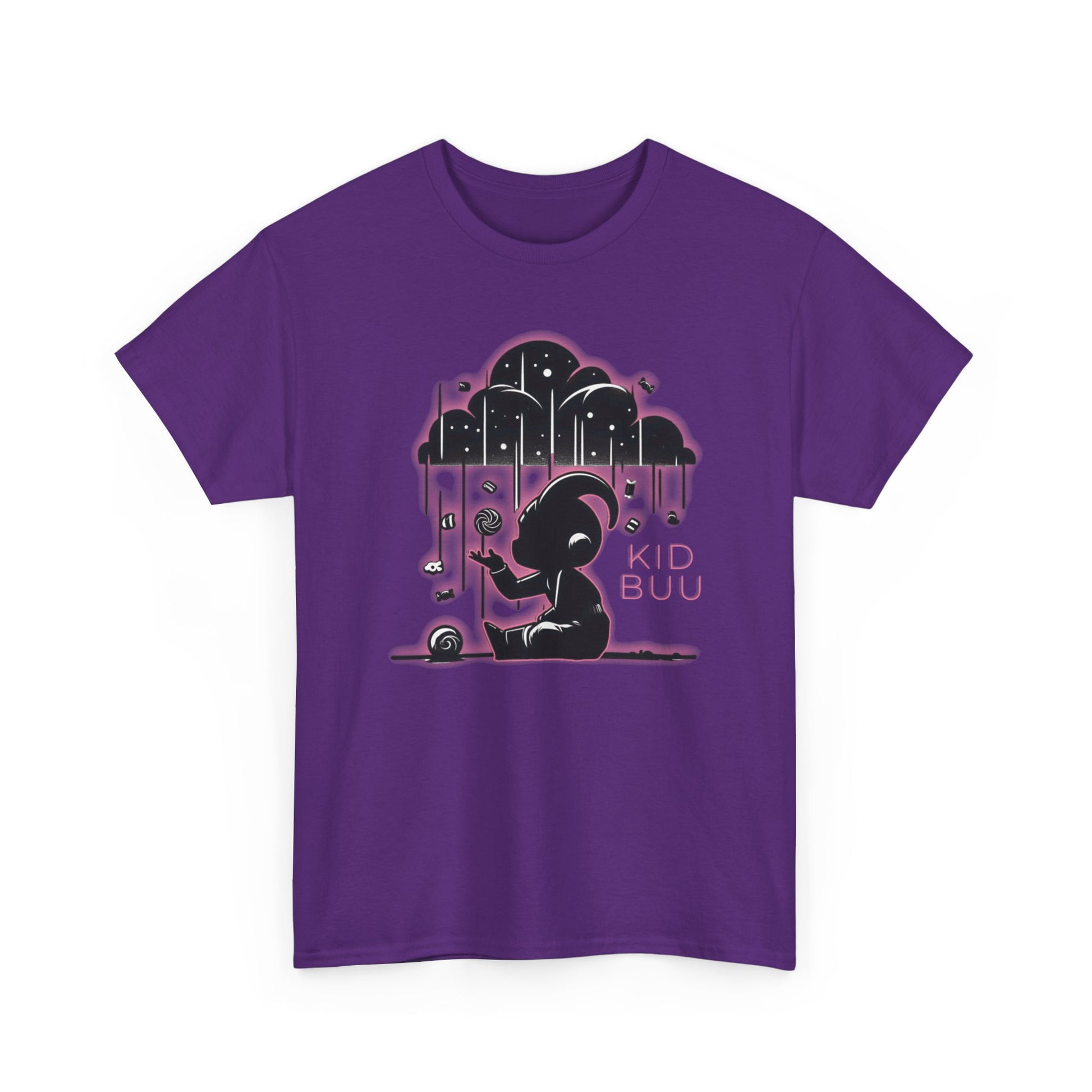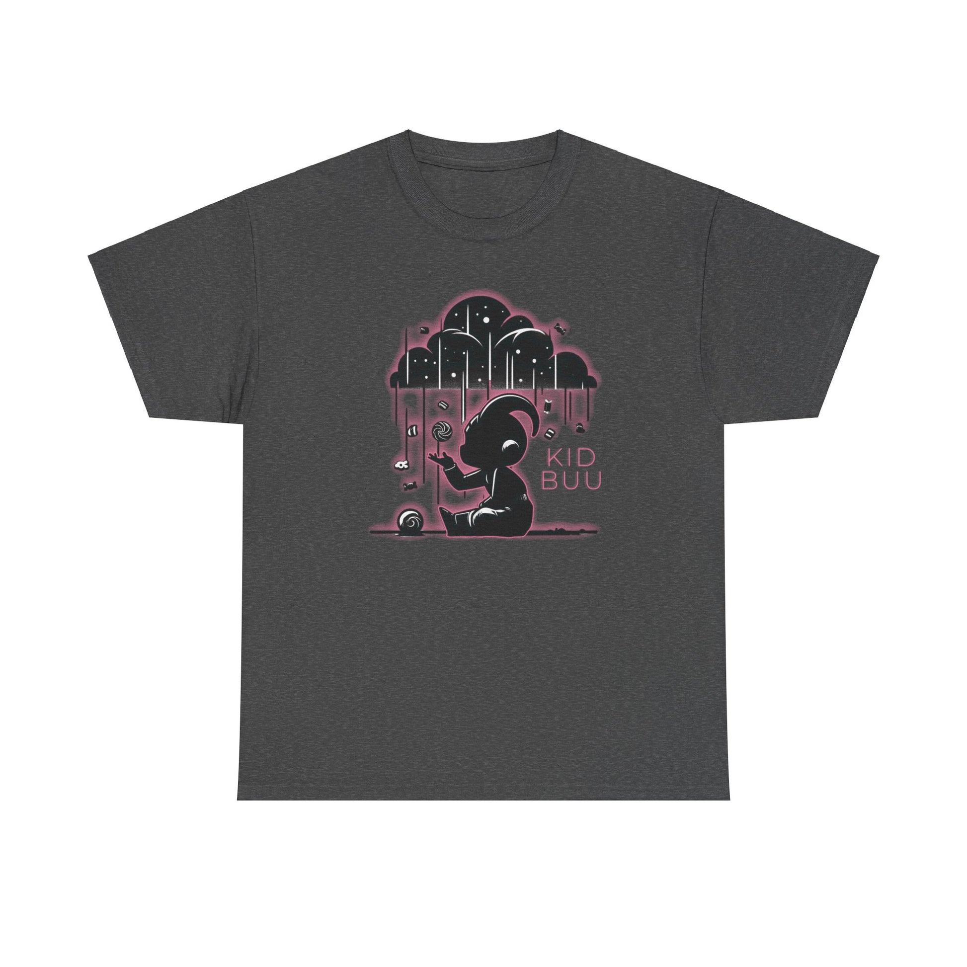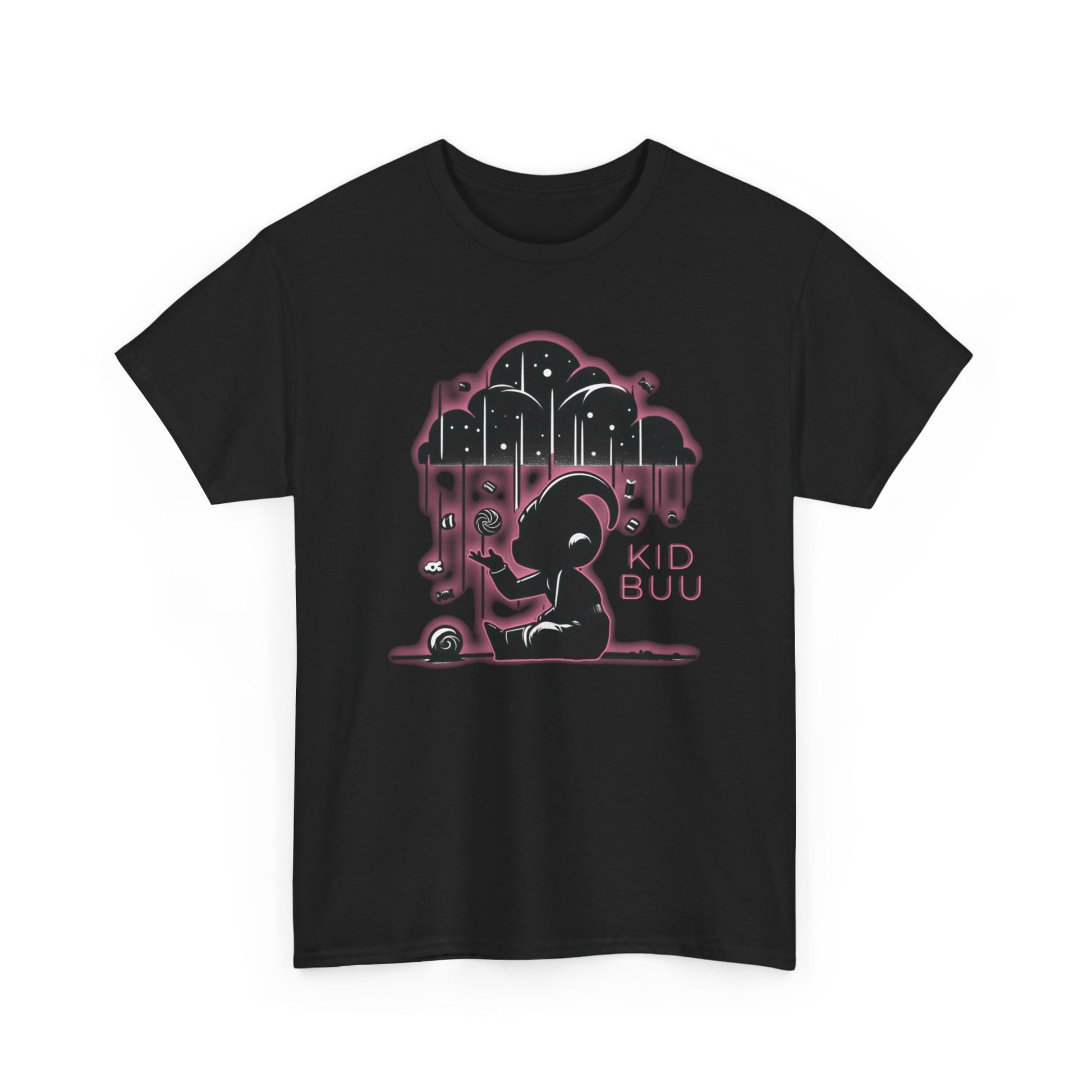 Sweet Surrender: Kid Buu's Candy Shower Tee – because even the galaxy's bad guys have a sweet tooth! Join Kid Buu in this hilarious escapade as he casually sits through a downpour of candies, proving that even the evilest beings can't resist a sugar rush.