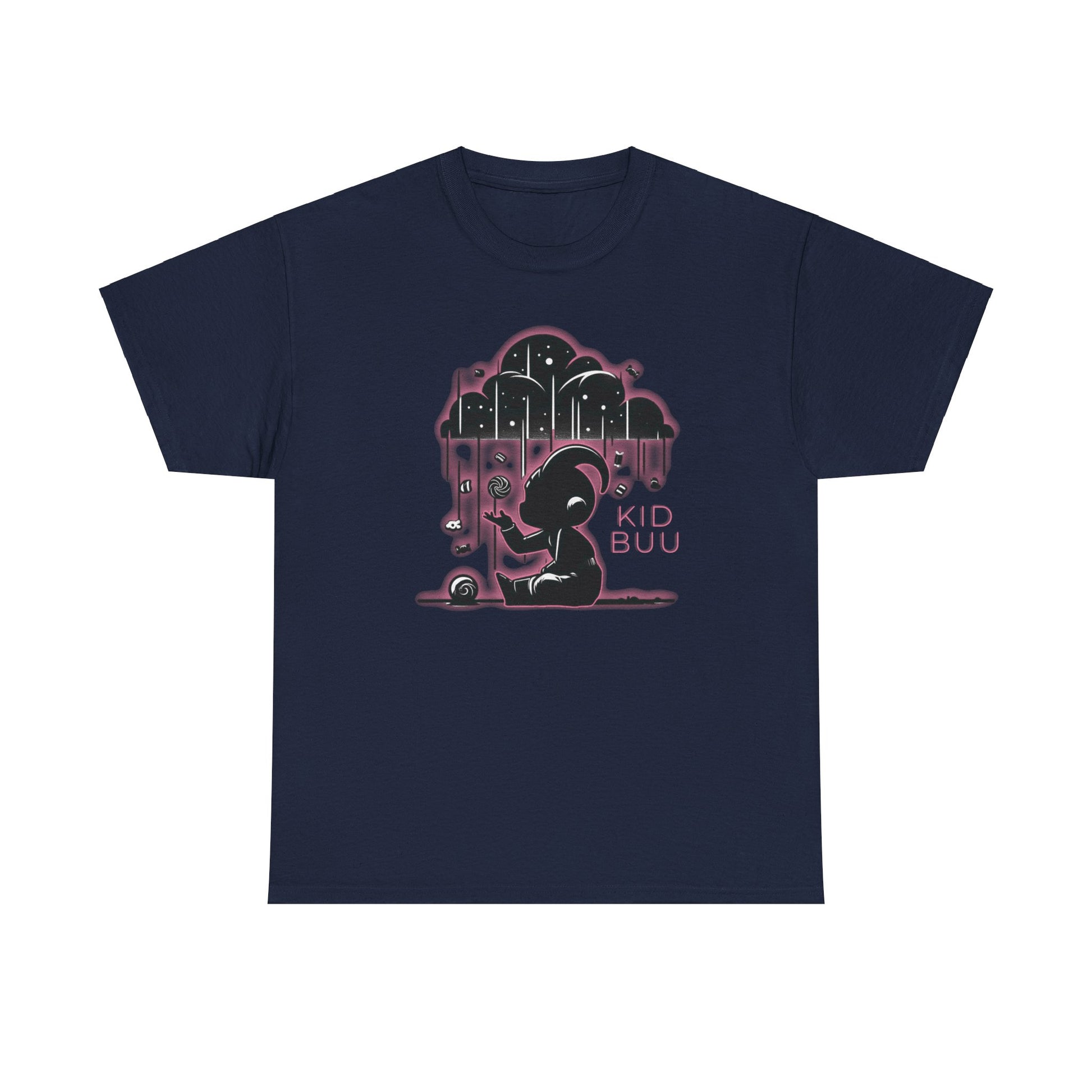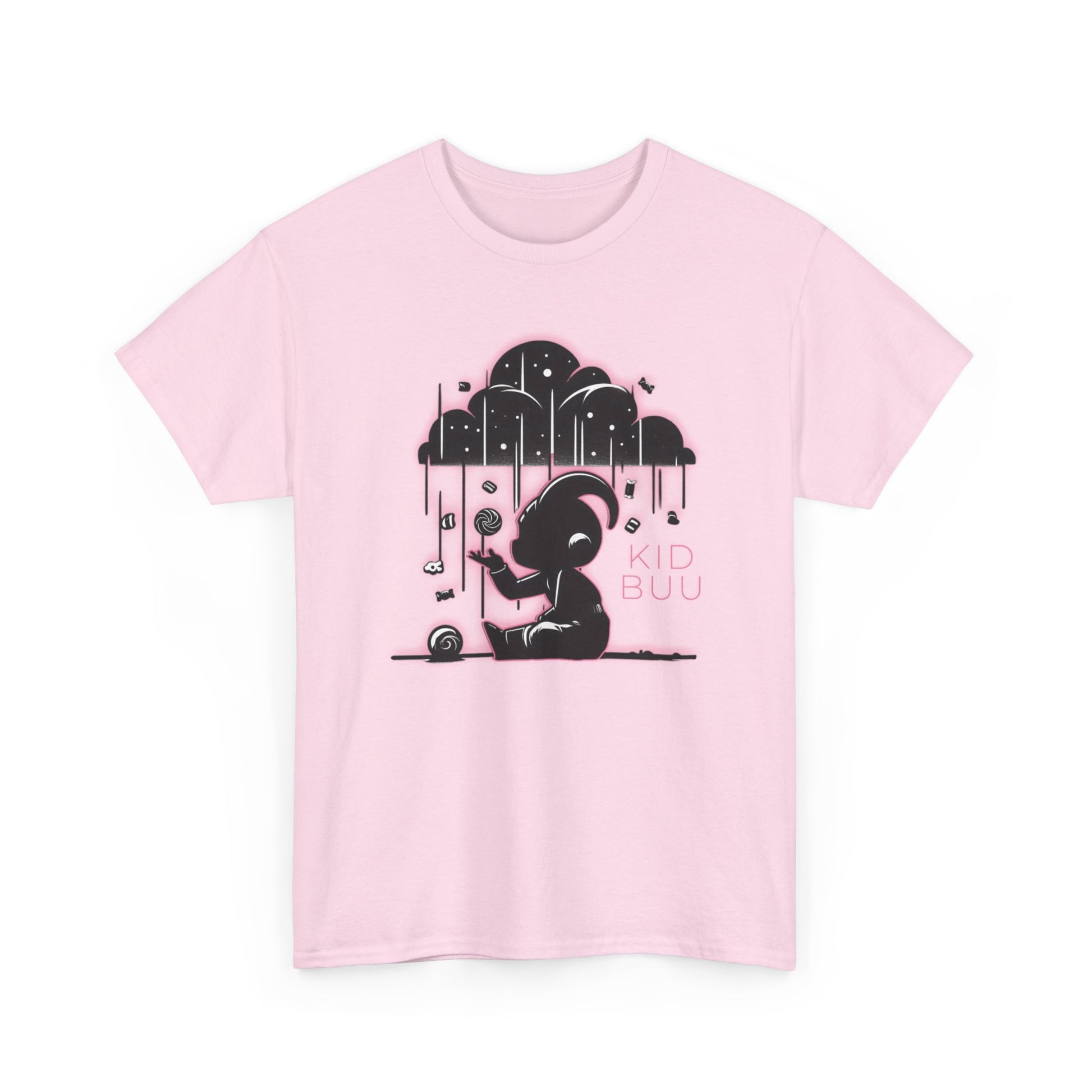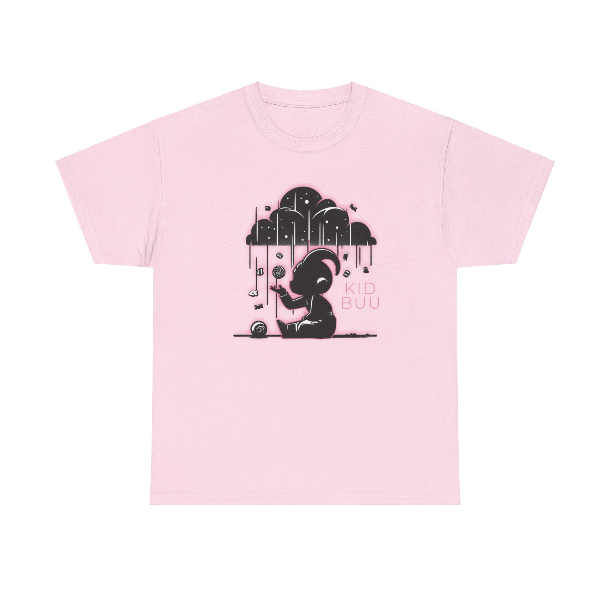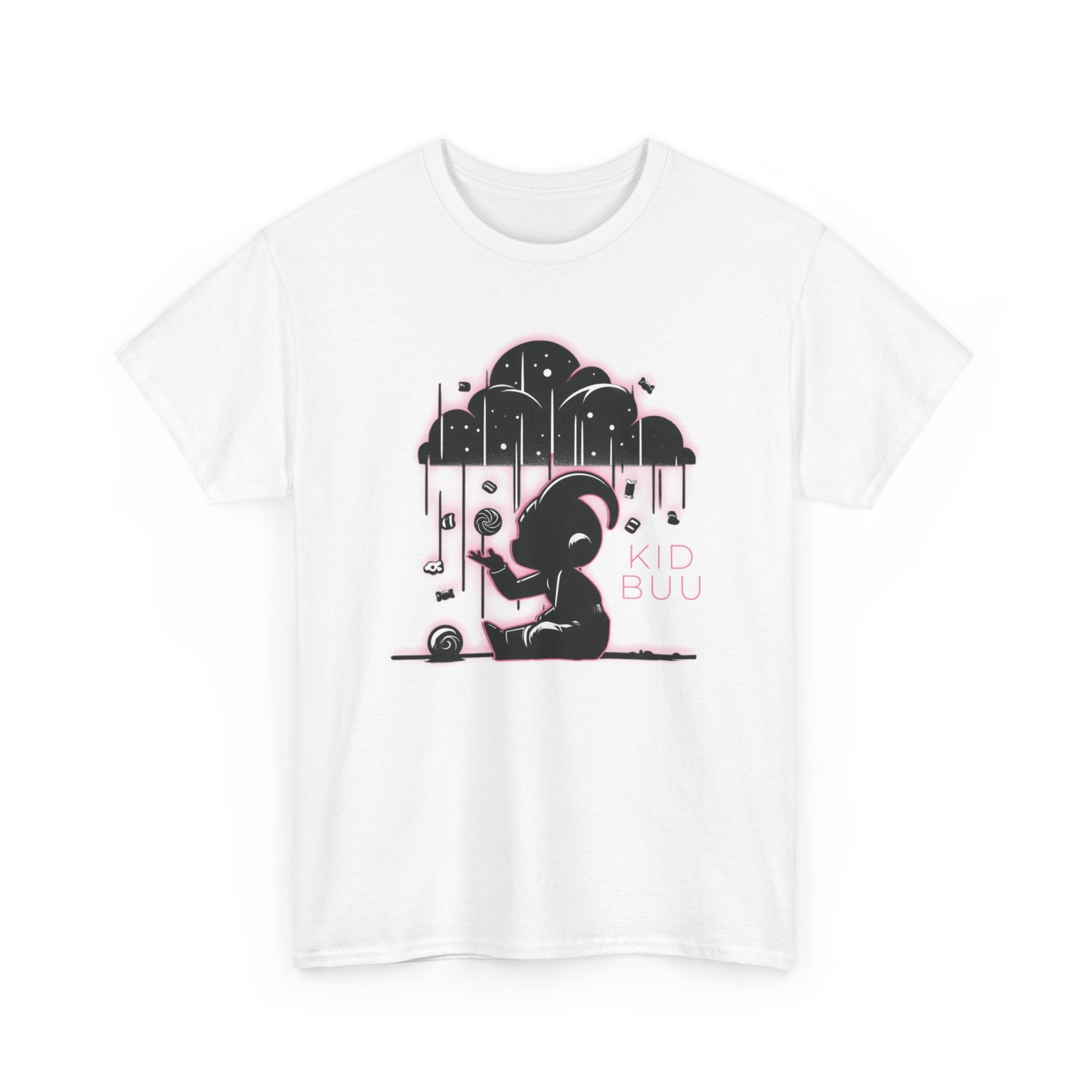 Sweet Surrender: Kid Buu's Candy Shower Tee – because even the galaxy's bad guys have a sweet tooth! Join Kid Buu in this hilarious escapade as he casually sits through a downpour of candies, proving that even the evilest beings can't resist a sugar rush.