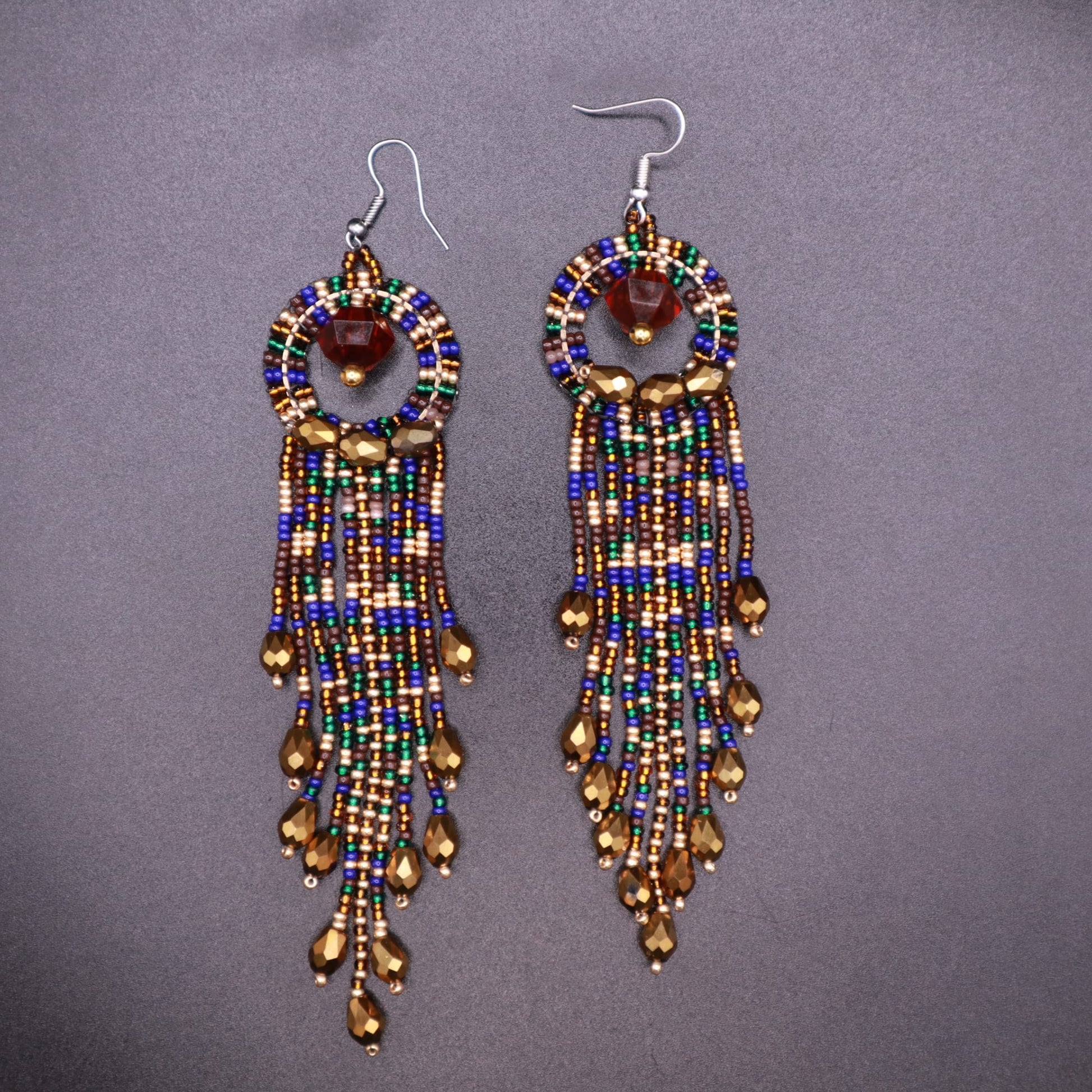These long lightweight fringe earrings are crafted with seed beads crystals and miyuki and golden colors. These beadwork indigenous earrings are comfortable and super lightweight, and they are perfect as a gift for women.