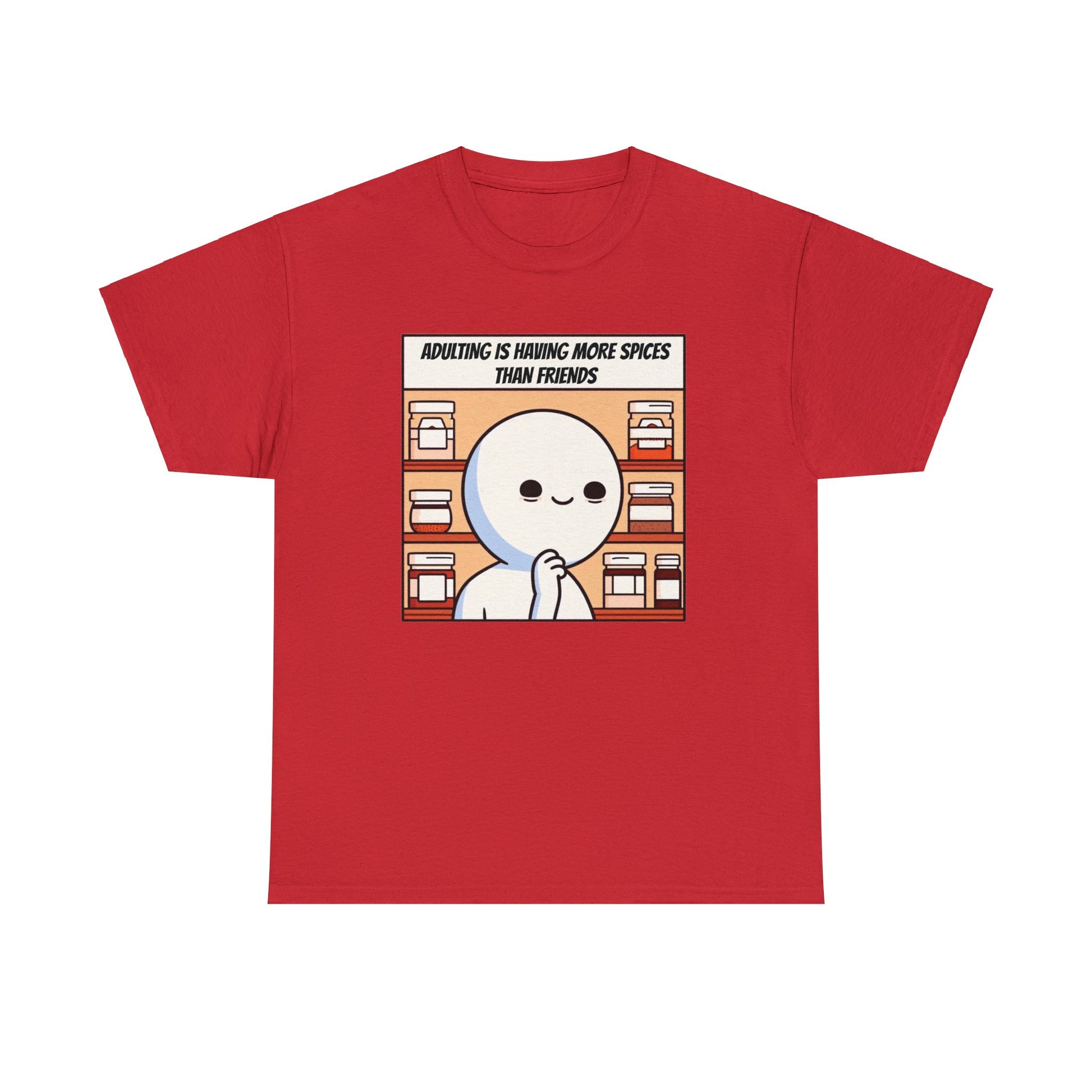 Spice of Life: Adulting Edition – Where Paprika Outnumbers Pals! The unisex heavy cotton tee is the basic staple of any wardrobe. It is the foundation upon which casual fashion grows. No side seams mean there are no itchy interruptions under the arms. The shoulders have tape for improved durability. .: Made with medium fabric (5.3 oz/yd² (180 g/m²)) consisting of 100% cotton for year-round comfort that is sustainable and highly durable. .: The classic fit of this shirt ensures a comfy, relaxed wear while the crew neckline adds that neat, timeless look that can blend into any occasion, casual or semi-formal. .: The tear-away label means a scratch-free experience with no irritation or discomfort whatsoever. .: Made using 100% US cotton that is ethically grown and harvested. Gildan is also a proud member of the US Cotton Trust Protocol ensuring ethical and sustainable means of production.