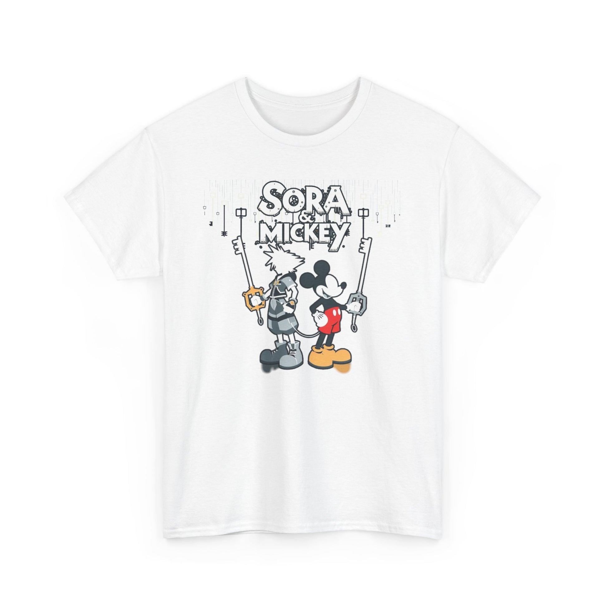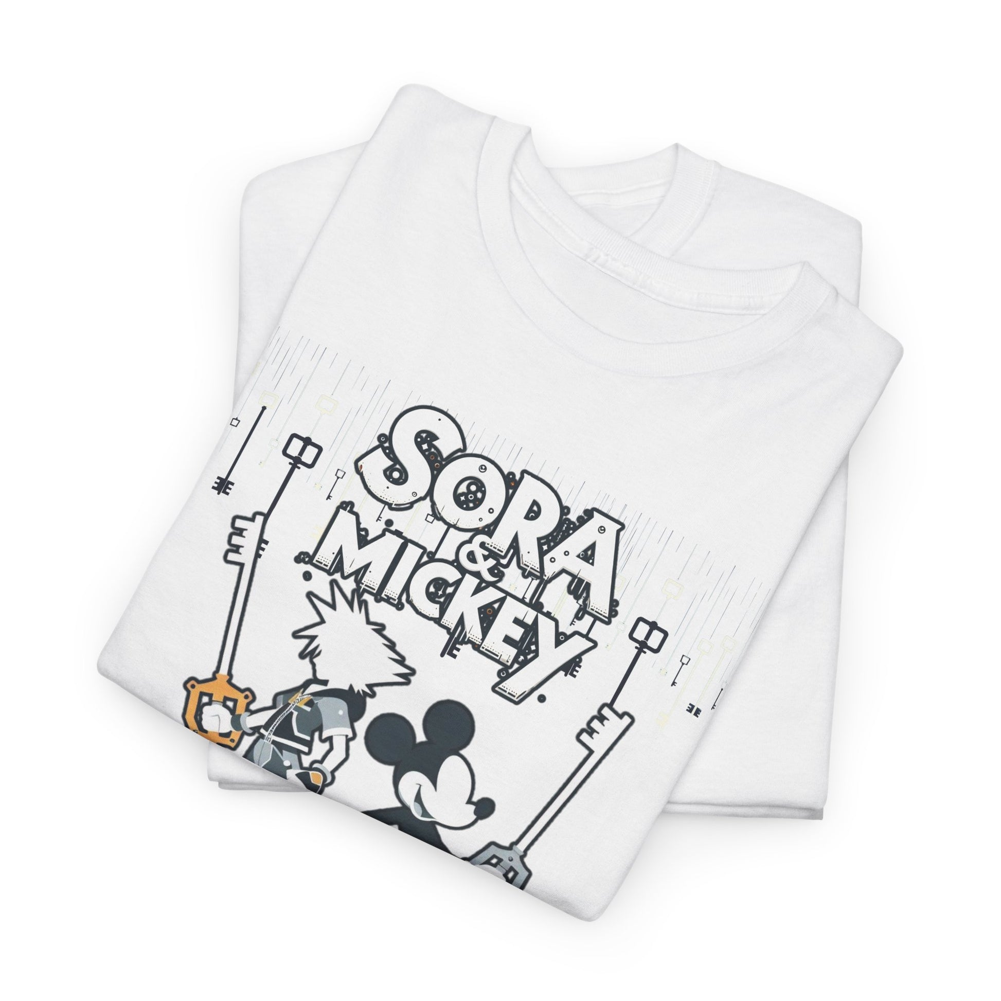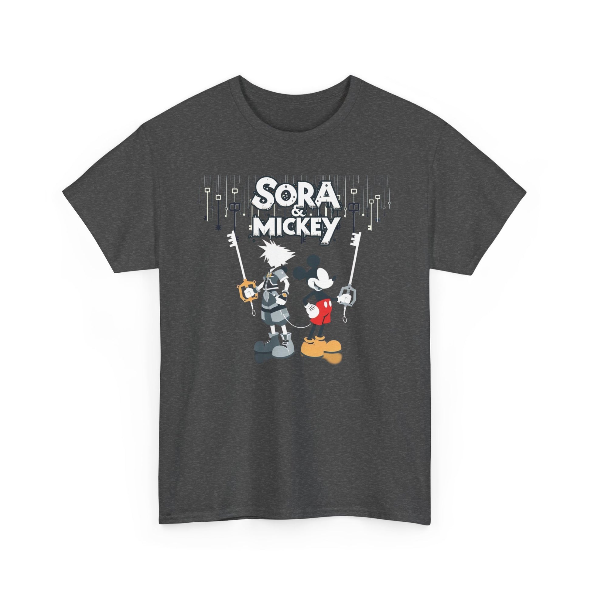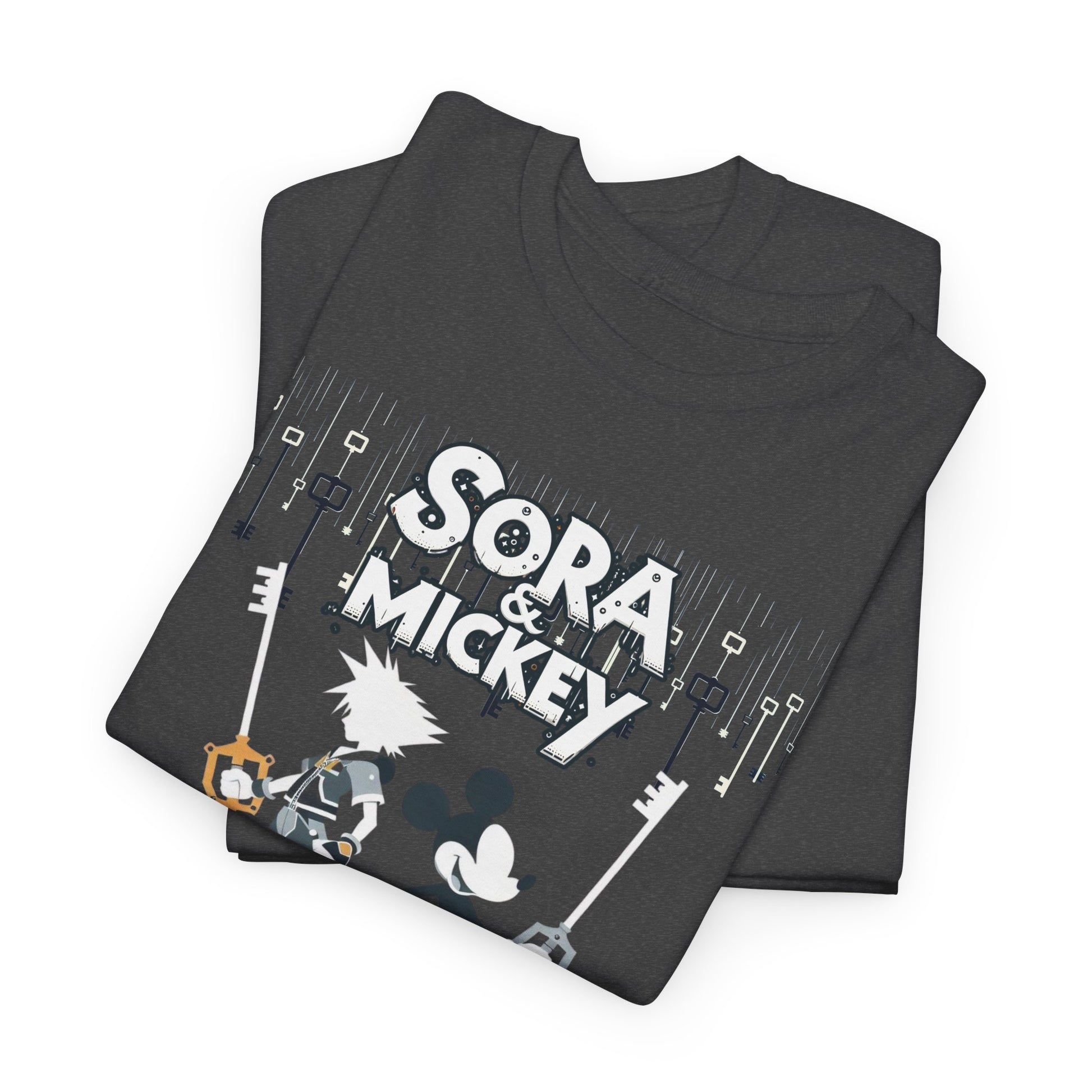 Featuring the dynamic duo of Sora and Mickey standing back to back, wielding their keyblades with unmatched finesse, this tee is pure action-packed awesomeness. Crafted for both comfort and style, it's perfect for unleashing your inner hero or heroine in any realm. 💪
