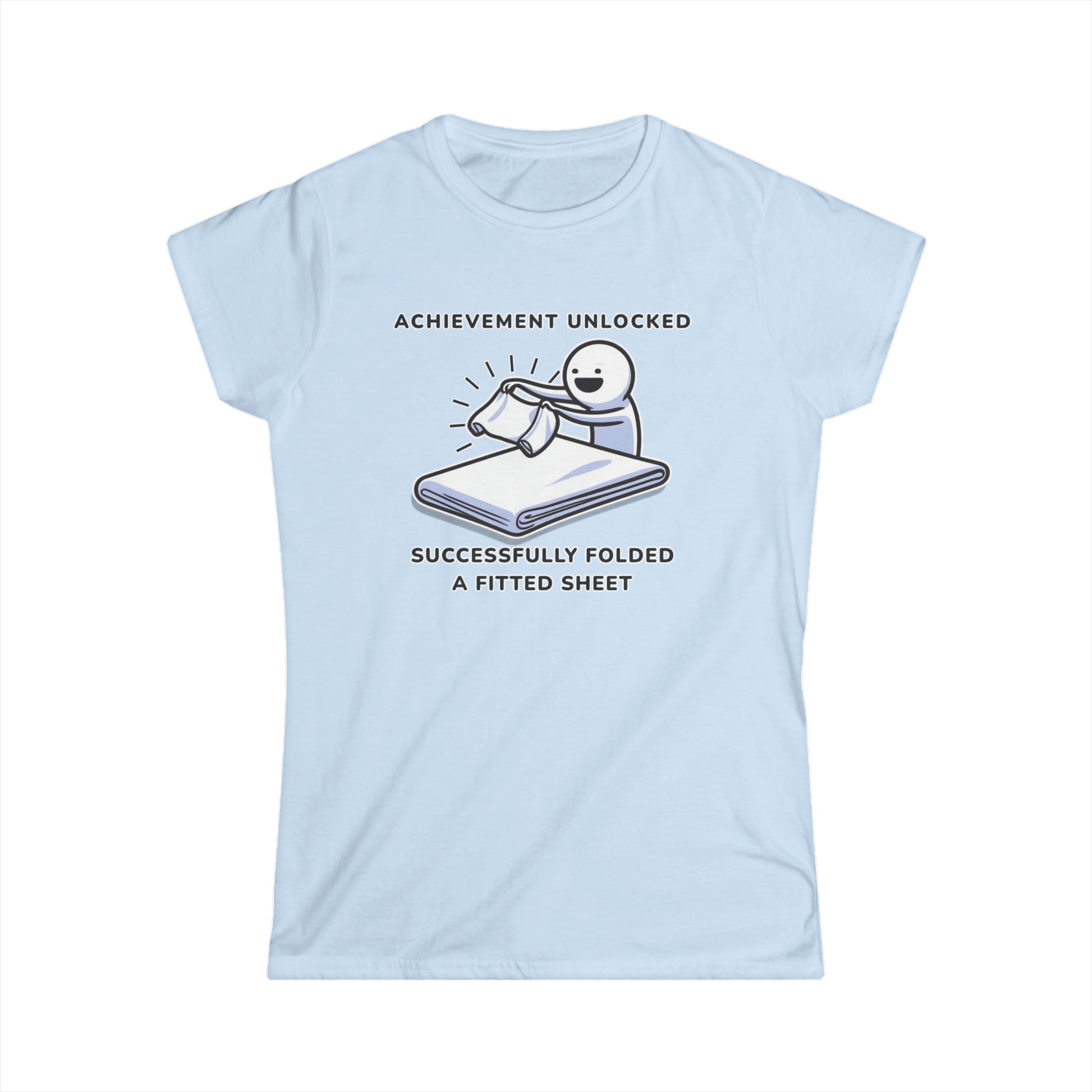 Unleash your inner adulting pro with our Women's Cotton Comfort Achievement Unlocked tee! Featuring a clever graphic about nailing the art of folding a fitted sheet, this fitted sheet fold meme tee is sure to bring a smile to any seasoned or aspiring adult's face. Get ready to master the ultimate task with this quirky and comfy tee!